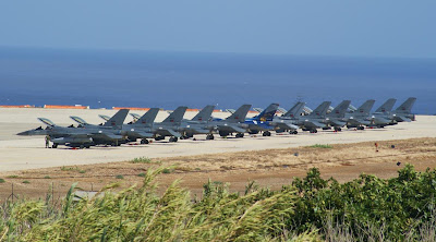 | Doze F16 da força aérea Portuguesa alinhados na placa do aeroporto do Porto Santo |